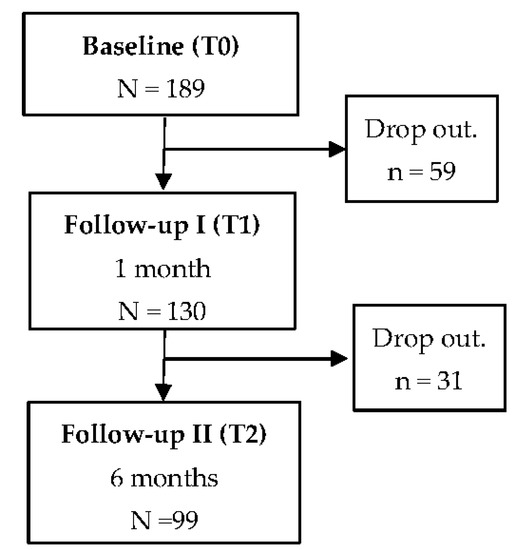 In this way, we approached a total of 422 Spanish-speaking au pairs living in Germany. According to the inclusion criteria, 189 participants were eligible for the study. A total of 90 (47.6%) participants dropped out of the study during the follow-ups, so that for 99 individuals data was available for baseline and both follow-ups (Figure 1).