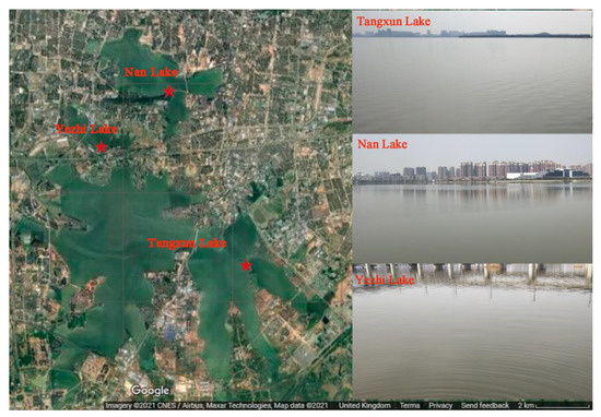 The water samples were collected from three adjacent freshwater lakes (i.e., Tangxun Lake, Yezhi Lake and Nan Lake) in Wuhan, China. Tangxun Lake is the largest urban lake in Asia, with an area of 52.2 km2, while Nan Lake and Yezhi Lake are much smaller, with water areas of 7.6 and 1.6 km2, respectively. The surface water samples (top 30 cm) were collected on sunny days on 20 June 2018 (summer), 26 September 2018 (autumn), 27 December 2018 (winter) and 8 March 2019 (spring). The water temperatures were about 9, 27, 20 and 3 °C for spring, summer, autumn and winter, respectively. Representative locations along with the scenery of the three stations for surface water sampling are depicted in Figure 1. The water samples in spring, summer, autumn, and winter are denoted as JCTXL, JXTXL, JQTXL and JDTXL for Tangxun Lake; JCYZL, JXYZL, JQYZL and JDYZL for Yezhi Lake and JCNL, JXNL, JQNL and JDNL for Nan Lake. One liter of water was collected via a water sample collector. The collected water samples were stored temporarily in plastic bottles in a foam box packed with ice bags. The collected water samples were analyzed within 4 h.