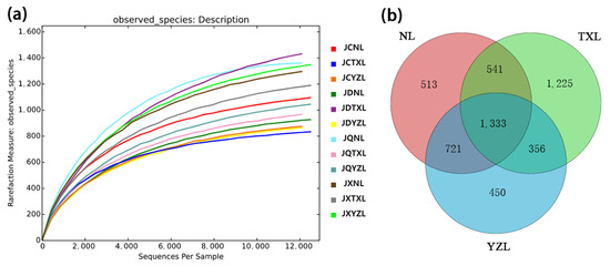 (a) Rarefaction curves of operational taxonomic units; (b) Venn diagram. The water samples in spring, summer, autumn, and winter, respectively, are denoted as JCTXL, JXTXL, JQTXL and JDTXL for Tangxun Lake, JCYZL, JXYZL, JQYZL and JDYZL for Yezhi Lake and JCNL, JXNL, JQNL and JDNL for Nan Lake.