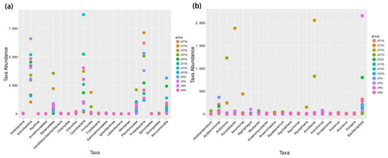 The V4 region of bacterial 16S rRNA genes was amplified using a primer set of 520F-802R [30]. The Illumina Miseq platform was applied for the paired-end sequencing of the DNA fragments. The sequence analyses were conducted as described [31]. The 16S rRNA gene sequence can be obtained from the NCBI website (http://www.ncbi.nlm.nih.gov/sra/, PRJNA631438, accessed on 22 June 2020).