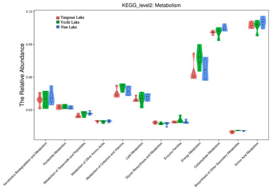 It has been reported that Luteolibacter in the surface water of fresh lakes in winter is a potential bacterial indicator of good-quality lakes [41]. In this study, the abundance of Luteolibacter of Tangxun Lake, Yezhi Lake and Nan Lake in winter was 0.19, 3.43 and 12.03%, respectively. This suggested that Nan Lake had the best water quality among the three eutrophic lakes. In fact, it can be seen from Figure 5 that the bacteria in Nan Lake had higher function than the other two lakes in terms of substrate metabolism, such as carbohydrate metabolism, amino acid metabolism, lipid metabolism, etc. This also indicated that Nan Lake had the strongest self-purification ability among the three lakes.