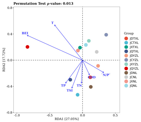 RDA analysis was applied to look into the relationship between bacterial community and water quality. As shown in Figure 6, BEI and temperature were the most significant parameters for shaping the bacterial communities of lake water, reflected by the length of the arrow-lines. Indeed, BEI can be a feasible bacterial index for eutrophic assessment of freshwater lakes [28], which is significantly impacted by temperature [29]. This can be ascribed to the abundance of aquatic bacteria (e.g., cyanobacteria) that can reflect the water quality of lakes, which is impacted by the temperature. Other research results also indicated that temperature was a key factor affecting the bacterial abundance in water [43]. Moreover, it appears that the BEI had a positive correlation with temperature, and that TN had a positive correlation with TP. Although both phosphorus and nitrogen have been deemed as the most important parameters for eutrophication, TP seemed to have a slightly greater impact on shaping the bacterial community in lake water than TN in this study.