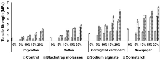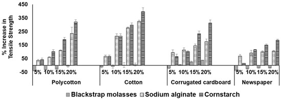 To quantify the increase in tensile strength as influenced by the binder, the percentage increase was calculated by using a control (0% binder) as a reference (Figure 6). It is evident that tensile strength increased with increase in binder concentration, particularly for cornstarch and sodium alginate binders. Generally, a direct correlation is typically found between the binder concentration and the tensile strength [52,53,54]. Among the binders, 20% cornstarch provides the highest percentage increase in tensile strength for cotton and polycotton, by 395% and 320%, respectively. Furthermore, in the case of corrugated cardboard and newspaper, the highest increase in tensile strength of 310% and 185% was obtained. Pulp fibers dispersed in a binder matrix enhanced the tensile strength of the resulting material [55].