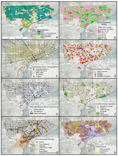 Urban and environmental features of Detroit, Michigan: (a) the study area including the city limits (red outline), inner-city location (black oval), and predominant racial/ethnic group by census tract (2011–2015 American Community Survey, U.S. Census Bureau), (b) the geographic distribution of difference of median household income (DMHI) between 2013 and 2017 by census tract, (c) public and alternative transportation, (d) educational facilities, (e) government assets and commercial or office areas, and (f) health-related facilities and green areas, (g) environmental pollution, and (h) urban decay features.