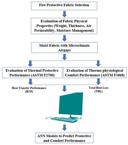 This research aimed to develop sophisticated computational models in order to fulfil the above-mentioned knowledge gaps. In this work, the ANN modeling approach was used for a more realistic prediction of thermal protective and thermo-physiological comfort performance of fabrics by considering sweat moisture and the microclimate air gap. For this, we characterized the thermal protective and thermo-physiological comfort performance of fabrics in order to identify the key fabric properties affecting performance. By employing the key fabric properties, an ANN model was developed for predicting performance. Notably, the developed model could lead to prediction of the thermal protective performance of fabrics under flame and radiant heat exposure.