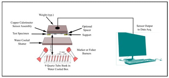 The thermal protective performance of the fabrics was measured under 2 ± 0.05 cal/cm2 s heat flux with a combination of convective and radiant heat exposure using the ASTM F 2700 standard as shown in Figure 2 [16]. The samples were positioned horizontally and the unsteady-state heat transfer through the specimen was measured using a copper slug calorimeter. The transmitted heat sensor was a 4 ± 0.05 cm diameter circular copper slug calorimeter constructed from electric grade copper. This standard was designed to measure the heat transfer performance of materials that are exposed to combined convective and radiant thermal hazards. Maker or fisher burners, two of each, with a diameter of 38 mm top and 1.2 mm orifice size were used as one of two thermal energy sources. As the second source, nine 500 W T3 translucent quartz infrared lamps were arranged in a liner array with 13 ± 0.5 mm spacing between center to center, and 125 ± 10 mm from the specimen surface. Testing was carried out on two different air gaps (0 and 6 mm) with three different amounts of moisture (0 (dry), 20, and 50%). Self-designed air gap sizes that are equivalent to the ASTM standards requirements were chosen in this study. Additionally, 0% moisture was the base line of measuring the protective performance; then, moisture was increased up to 50%. Previous studies showed that the protective performance is lowest at 20% added moisture and steadily increases up to 50% [30]. This led us to choose 0, 20, and 50% moisture in this study. The air gaps between the sensor and the fabric were created by using a 6 mm spacer between the sensor assembly and the back surface of the specimen. The required amount of distilled water was sprayed on the back side of the fabric surface to simulate the absorbed sweat. In this study, distilled water was used; human sweat can be either acidic or alkaline, and different solutions might have different effects on performance, so distilled water was used to keep the effects consistent. Three samples of 150 by 150 ± 5 mm were prepared for testing for each testing scenario. In total, there were six different testing scenarios for each fabric type. The average value of three samples was taken to determine the heat transfer performance value. Sample exposure was terminated when the total accumulated thermal energy measured by the calorimeter met the following empirical performance curve: cal/cm2 = 1.1991 × ti0.2901, where ti is the time since the initiation of the thermal exposure. This time value determines the heat transfer performance (HTP) value for test specimen and is given by J/cm2 or cal/cm2. The fabric with a higher HTP value usually has higher resistance to flame and should provide more heat protection to the wearer.