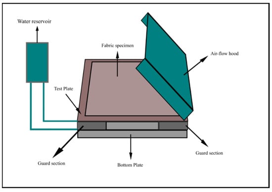 The thermo-physiological comfort performance of the fabric was measure using the ASTM F 1868 standard test method (Figure 3). A guarded flat plate was composed of a test plate, guard section, and bottom plate, each electrically maintained at a constant temperature in the range of human skin temperature between 33 and 36 °C. The size of the samples was 450 × 450 mm and was large enough to cover the surface of the hot plate test section and the guard section completely. Testing was carried at 0 and 6 mm air gaps in both dry and wet conditions. In order to consistently compare the thermo-physiological comfort performance data set with the protective performance data set, this study chose 0 and 6 mm air gaps for the protective performance test. The air gap between the sensor and the fabric was created in a similar way to that used in the thermal protection performance test, by using a 6 mm spacer between the sensor assembly and the back surface of the specimen. There were four different testing scenarios for each fabric. In total, 12 samples (3 samples for each testing scenario) were prepared from each fabric type for testing. Values of three samples from each fabric were measured and averaged. Thermal resistance is the resistance to the flow of heat from a heated surface to a cooler environment. Total resistance to dry heat transfer (Rct) for a fabric was calculated using the following formula: