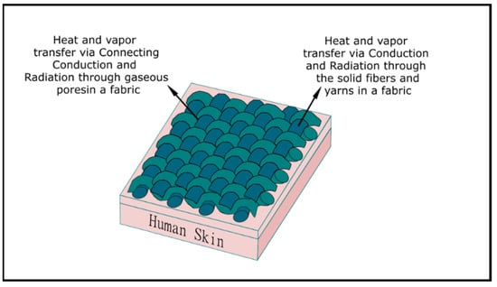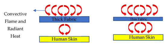 Based on the linear regression analysis between the two fabric properties (thickness and air permeability) and performance (HTP and THL), it was found that the regression coefficient of thickness was the highest. This means that thickness is the key property that can affect the HTP/THL of dry and moistened fabric with and without an air gap. This is because the thickness of the fabric plays an important role in heat and mass transfer through the fabrics in the processes of convection, conduction, radiation, and/or mass diffusion [58]. In general, a fabric is a porous media with combined solid fibers and yarn phases as well as gaseous trapped air phases in between the fibers and yarns. Eventually, these solid (fiber and yarns) and gaseous (pores) phases could help to transfer the heat and vapor via convection, conduction, radiation, and/or mass diffusion [59] (Figure 4). In the presence of thick fabric, less convective flame and radiant heat transfer occurs through the fabrics’ solid and gaseous air phases in comparison to that of thin fabric; as a result, more time is required to generate burns on wearers’ skin and that can cause a higher HTP [58] (Figure 5). Similarly, thick fabric could transfer less metabolic heat and sweat vapor from human skin to the ambient environment through the solid and gaseous air phases in the fabric; as a result, the THL would be lower and generate more discomfort to wearers (Figure 6). As HTP and THL are phenomena associated with heat and mass transfer through the fabrics, thickness plays an important role for thermal protective and thermo-physiological comfort performance of fabrics. Therefore, thickness was used for the ANN modeling for predicting the thermal protective (HTP) and thermo-physiological comfort (THL) performance. In summary, it is notable that a fabric with high thickness could enhance the protective performance; however, it could significantly lower the comfort performance [52]. In this study, the main goal was to identify the key fabric properties that significantly affect performance, so thickness was chosen irrespective of its positive or negative effect on the performance.