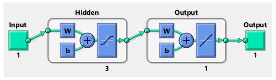 To predict the protective and comfort performance of moistened fabrics with a microclimate air gap using the key fabric properties identified in Section 3.1, the ANN approach was employed. The diagrams of these ANN models are presented in Figure 7 and Figure 8, where w represents the ANN weights and b represents the biases. The coding of these ANN models is presented in Appendix A and Appendix B. The best predictive ANN model for HTP had one neuron in its hidden layer (Figure 7), while the best predictive ANN model for THL had three neurons in its hidden layer (Figure 8).