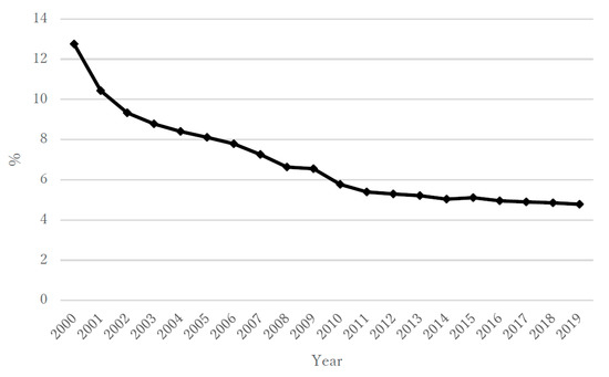 The annual unemployment rate in Kazakhstan during 2000–2019.