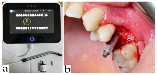 Primary stability was measured immediately after implant placement in both mesiodistal and vestibulo-oral orientation using an Osstell Idx device (Figure 2a).