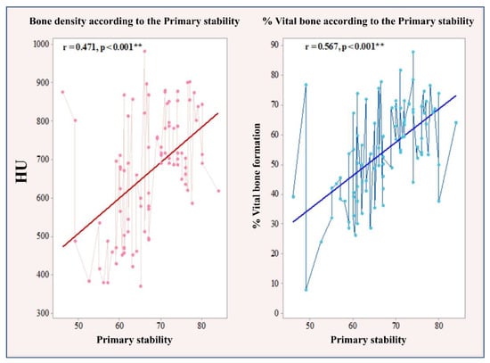 The correlation between primary and secondary stability with bone density and the amount of vital bone formation was examined by correlation analysis. Primary stability values were correlated with bone density and vital bone formation via Pearson’s test. Regarding the secondary stability, correlation analysis was performed with the Spearman rank correlation test.