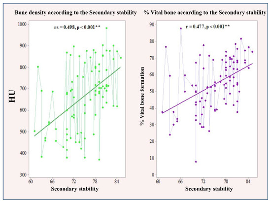 The Pearson correlation test revealed an average significant association of secondary stability with bone density (rs = 0.498, p < 0.001) and percentage of newly formed bone (r = 0.477, p < 0.001). The significant linear correlation between primary and secondary stability and bone density and percentage of newly formed bone is illustrated in Figure 3 and Figure 4.