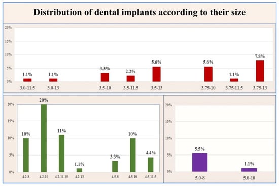 Depending on the length of the implant, they were distributed as follows: 17 short (≤6.0 mm), 59 standard (>6 mm–<10 mm) and 14 long (≥10 mm). Implants with standard size (65.50%) were prevalent in comparison to the other two groups (short 19%; long 15.50%), p < 0.001 (Figure 5).