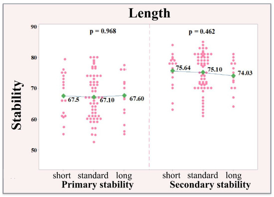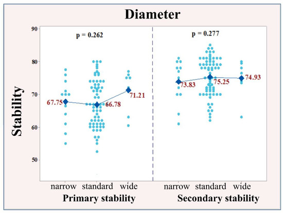 А covariance analysis (ANCOVA) was performed to compare the mean values of primary and secondary stability according to the diameter (narrow, standard, wide) and implant length (short, standard, long). Тhe material used for socket preservation was considered as a covariate, which might affect primary and secondary stability. The mean values of primary stability in all three implant sizes, regarding the diameter of the implants, were similar (narrow 67.75; standard 66.78; wide 71.21) with no significant difference (p = 0.262). The same tendency was observed for secondary stability (narrow 73.83; standard 75.25; wide 74.93), with no significant difference, p = 0.277. The similar distribution of the individual values and the approximate mean values of primary and secondary stability according to the diameter of the implants are illustrated in Figure 6.