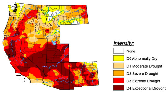 U.S. Drought Information. Source: Fusch, 2021, https://droughtmonitor.unl.edu/data/pdf/20210608/20210608_west_text.pdf (accessed on 15 January 2021). The U.S. Drought Monitor is jointly produced by the National Drought Mitigation Center at the University of Nebraska-Lincoln, the United States Department of Agriculture, and the National Oceanic and Atmospheric Administration. Map courtesy of NDMC.