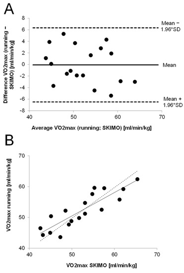Agreement in O2max values between running and SKIMO. (A): Bland–Altman plot showing the differences between running and SKIMO against average O2max values. (B): O2max values for uphill running against SKIMO, including regression line (solid) and ideal line (dashed).