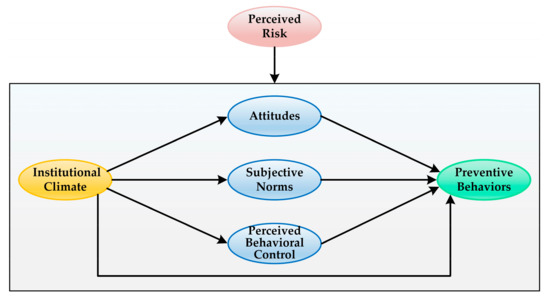 To overcome the limitations of existing studies, our study explicitly identifies the impacts of the institutional climate, attitudes, subjective norms, perceived behavioral control and perceived risk of university students’ COVID-19 preventive behaviors based on an extended theory of planned behavior (TPB) model. The TPB model proposed by Ajzen [14] may be one of the most influential theoretical perspectives to explain a range of health behavior intentions or actual behavior. While the TPB has been used in several recent studies of COVID-19 preventive behaviors [15], to improve the predictive capabilities of the TPB model, it is necessary to study university students’ COVID-19 preventive behavior by including the institutional climate in the TPB model, because the critical role of HEIs in the prevention and control of COVID-19 has been widely reported in the literature [16]. Although the existing literature recognizes the moderating role of risk perception on a range of health behaviors [17], to the best of our knowledge, no previous study has examined the variations in the influence of institutional factors and TPB components on COVID-19 preventive behaviors in terms of different levels of risk perception.
