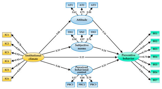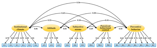 As can be seen in Table 4, all of the correlation coefficients among the variables were significant and had the anticipated sign. Specifically, the institutional climate was positively correlated to preventive behaviors (r = 0.343, p < 0.001). Attitudes (r = 0.192, p < 0.001), subjective norms (r = 0.405, p < 0.001) and perceived behavior control (r = 0.407, p < 0.001) were each significantly associated with preventive behaviors. The institutional climate was also significantly correlated with attitudes (r = 0.055, p < 0.01), subjective norms (r = 0.317, p < 0.001) and perceived behavior control (r = 0.352, p < 0.001). These correlations met the conditions for mediation suggested by Baron and Kenny [62]. Moreover, as the square roots of the AVEs for all of the constructs were higher than the correlations among them, the discriminant validity of the measurement was confirmed [61].