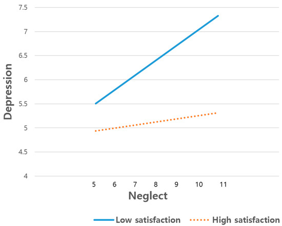 Table 2 shows the moderating effect of satisfaction with the mentorship program on the association between neglect and depression among students in low-income families. The moderating effect of satisfaction with the mentorship program was statistically significant (β = −0.03, p < 0.05). In other words, satisfaction with the mentorship program moderated the relationship between students’ neglect and depression. Additionally, we found that neglect was positively related to depression, accounting for age, gender, academic performance and parental education (β = 1.00, p < 0.01) and parents’ higher education was negatively associated with depression (β = −1.44, p < 0.01). Figure 1 indicated the moderating effect of satisfaction with the mentorship program on the relationship. Regardless of how satisfied middle and high school students in low-income families were with the mentorship program, those who experienced low levels of neglect also reported low levels of depression. However, students who were more satisfied with the mentorship program showed lower levels of depression compared to those who were less satisfied with the mentorship program, regardless of how much they had experienced neglect by their parents (4.94 for the more satisfied group vs. 5.51 for the less satisfied group; 5.32 for the more satisfied group vs. 7.33 for the less satisfied group). That is, depression among low-income students was greatly influenced by levels of satisfaction with the mentorship program. In particular, if students frequently encounter neglect by their parents, the effect of satisfaction with the mentorship program was greater, showing a 1.82 score gap in depression among the less satisfied group, while there was a 0.38 score gap among the more satisfied group.