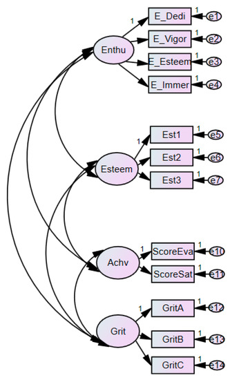 Within this panel data, questionnaire responses on self-esteem, grit, academic enthusiasm, and the academic achievement of first-grade students in middle school were used for this study. The instruments of this study were obtained from previous studies. The scale range was from 1 (strongly disagree) to 4 (strongly agree). To examine the adequacy of the scales, inter-correlations were taken.