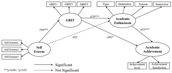 In order to analyze the relationship between major variables in this study, Standardized Path Estimates (β), Standard Error (S.E), t-value (C.R), and p-value were reviewed in the full mediation model. The results of analysis are shown as follows in Table 4 and Figure 4. The influence of self-esteem on GRIT turned out positive with β = 0.784 (p < 0.001). The influence of GRIT on academic enthusiasm was significant with β = 0.676 (p < 0.001). In addition, the influence of academic enthusiasm on academic achievement turned out to be significant with β = 0.633 (p < 0.001). On the other hand, the relationship between GRIT and academic achievement showed a negative relationship with β = −0.082 (p = 0.031), and the relationship between self-esteem and academic enthusiasm turned out to be of significance (p = 0.676).