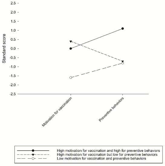 Figure 1 presents the standard scores of the motivation to receive a vaccination and adopt preventive behaviors against COVID-19 per latent class. The first latent class (39.8% of the sample, 417/1047) was named “high motivation for vaccination and preventive behaviors” and comprised participants with high scores in motivations for both vaccination and preventive behaviors. The second latent class (11.7% of the sample, 123/1984) was named “low motivation for vaccination and preventive behaviors” and consisted of those with low scores in both motivation for vaccination and preventive behaviors. The third latent class (48.4% of the sample, 507/1047) was named “high motivation for vaccination but low for preventive behaviors” and consisted of those with high scores for vaccination but low scores for protective behaviors.