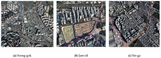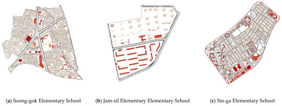 This study quantifies the pedestrian environment and network of the targets sites by examining the spatial structure in terms of the size of the block and the shape of the axis (i.e., formal/atypical) [16]. In respect to this study’s target sites, Soong-gok Elementary School possesses an irregular urban structure in which the spatial structure is naturally formed, blocks are cut off by arterial roads, and the horizontal pattern is partially mixed with a grid type and a curved irregular shape. Jam-sil Elementary School exhibits a pattern in which the spatial structure is standardized as a super grid, and the horizontal pattern is evenly distributed up, down, left, and right [21]. Finally, Sin-ga Elementary School possesses a spatial structure whereby the region is standardized as a grid, with the pattern distributed in a mixture of small-scale grid and cul-de-sac types centered on low-rise residential areas. Figure 2 presents the shape and spatial structure of the selected study sites.