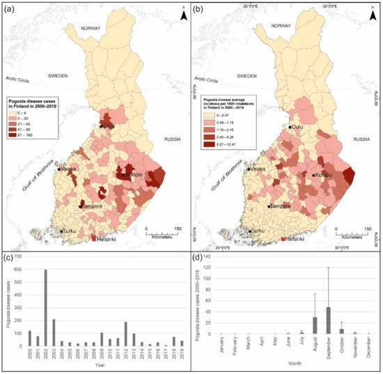 (a) Human Pogosta disease cases registered in Finland during 2000–2019. (b) The average incidence of Pogosta disease per 1000 inhabitants over a 20-year period in Finland. (c) Annual number of Pogosta disease cases, and (d) mean monthly Pogosta disease cases notified in Finland in 2000–2019 [22]. An incidence rate below 0.48 was considered as absence of the disease.