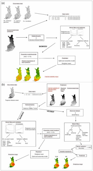 Workflow of modeling the spatial distribution of (a) potential SINV vectors with biomod2 approach, and (b) Pogosta disease with biomod2 and VECMAP approach.