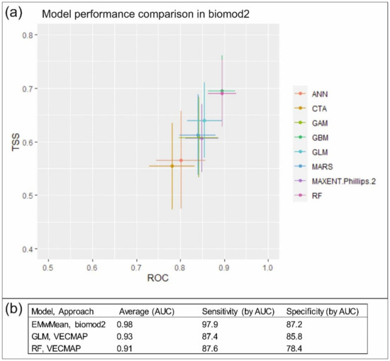 (a) Model performance comparison of 8 model algorithms by area under the receiver operating characteristic curve (AUC) and true skill statistics (TSS) values of 50 model runs in biomod2. The points represent the mean values and the solid lines represent the 95% range of variation. ANN = artificial neural networks; CTA = classification tree analysis; GAM = generalized additive models; GBM = generalized boosted models; GLM = generalized linear models; MARS = multivariate additive regression splines; MAXENT = maximum entropy models; RF = random forest model. (b) Model performance based on weighted mean ensemble model (EMwMean) in biomod2 and GLM and RF models in VECMAP.