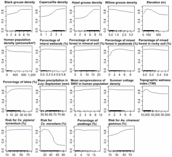 Based on the partial dependency plots, high densities of black grouse, capercaillie and hazel grouse indicated high probability of Pogosta disease occurrence (70–98%) (Figure 5). The high willow grouse densities, however, were associated with lower risk for Pogosta disease. A high proportion of mixed forest in peatland, peatbogs and lakes in the municipalities were associated with increased Pogosta disease risk (80–90%). In municipalities at elevations lower than 200 m, the Pogosta disease risk was higher (80–90%), compared to municipalities at higher altitudes. Furthermore, in municipalities at low to high topographic wetness index (TWI) rates, Pogosta disease risk remained high (80–90%). In the municipalities with a high probability of Ae. cinereus/geminus occurrence, Pogosta disease risk was also high (80–98%), and remained high also in municipalities with low to high suitability for Cx. pipiens/torrentium. In contrast, the disease risk decreased when the habitat suitability for Cs. morsitans increased to 50%, whereas in municipalities with low to moderate suitability (0–50%) for Cs. morsitans, the Pogosta risk was high (80–90%).