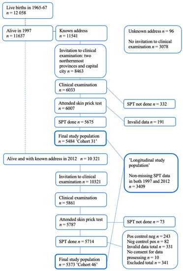 Our study data originated from the Northern Finland Birth Cohort 1966 (NFBC66), a longitudinal research program in the two northernmost provinces in Finland. The NFBC66 initially included all 12,058 children whose expected date of birth fell in the year 1966. The children of NFBC66 were followed regularly since their birth. The follow-up was conducted through health questionnaires and clinical investigations including skin examination [14,15]. To date, the cohort has been subjected to four main follow-up visits: at birth, and at 14, 31, and 46 years. Skin prick tests (SPTs) were performed at the ages of 31 and 46 years (Figure 1) [3]. Detailed information on the NFBC66 can be found on the research program’s website [16].