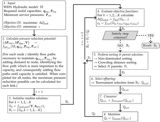 To achieve this, the approach depicted in Figure 1 was adopted. First, the novel algorithm for determining the maximum pressure reduction potentials was applied (step 1–2 in Figure 1, explained in Section 2.2). Using the calculated pressure reduction potentials as constraints, the NSGA-II algorithm was used to optimise the partitioning of the network (step 3–7 in Figure 1, explained in Section 2.3). The approach in Figure 1 will be explained further in the following sections.