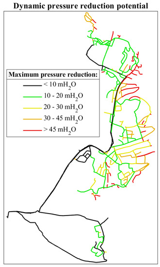 Maximal dynamic pressure reduction potential for a portion of Trondheim’s WDN, from [29].