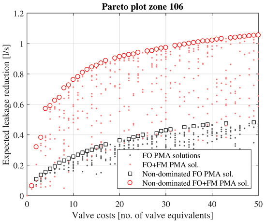 The Pareto plot for zone no. 106 (Figure 3) demonstrates how pressure management could effectively be used to reduce the leakage loss in the zone, both for the case assuming only FO PRVs as well as the case assuming combinations of FO and FM PRVs. Generally, the results for this particular zone show that the application of FM PMAs will be more effective in terms of expected leakage reduction than FO PMAs. For instance, the optimal expected leakage reduction achieved when installing 4 FO PRVs is 0.158 L/s, as also shown in Table 1. For the same valve cost, i.e., installing 2 FM PRVs, the expected leakage reduction is 0.572 L/s, i.e., 360% more than what can be achieved using only FO PRVs. For FO only PMAs configuration, the maximal possible potential for leakage reduction is around 0.47 L/s (assuming > 50 PRVs installed), while the equivalent potential for a combination of FO and FM PMAs is around 1.15 L/s.