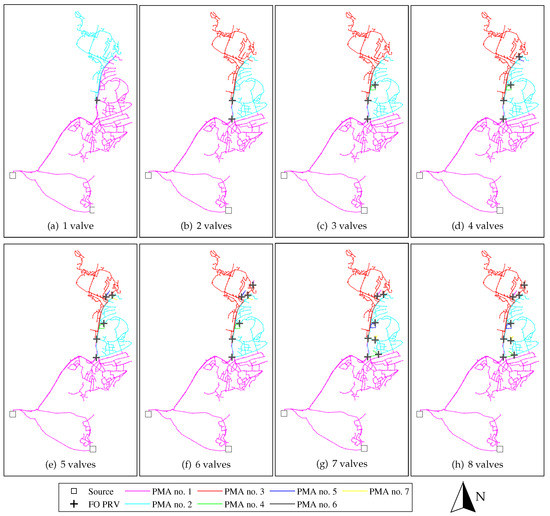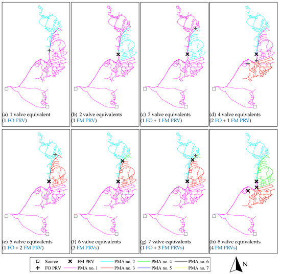 To keep the presentations of the results conceptually simple, the costs of the valves have been set as: , , and . Real costs for installation of valves have thus not been used, but by assigning the values 1 and 2 to and , respectively, it is assumed that the installation of a FO PRV has the cost of one cut, whereas the installation of an FM PRV is twice as costly. For easy comparability of the results, 1 FO PRV is henceforth referred to as 1 valve equivalent, while 2 FO PRV is referred to as 2 valve equivalents. By assigning , one implicitly assumes that the there are isolation valves present at the points where one wants to close the system, and that the closing of these valves does not imply any investment cost.
