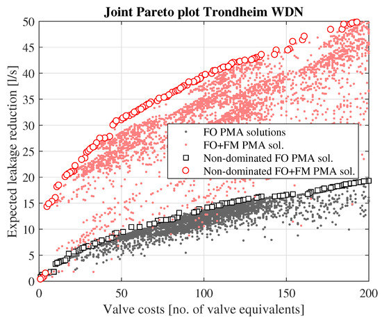 The economical optimisation demonstrates that one can expect as much as 4–5 times more leakage reduction if one choses the optimal solution using a combination of FM and FO PRVs (expected leakage reduction of 43.27 L/s, or 6.0%-points), with 85% of the expected leakage reduction occurring in PMAs assigned for dynamic pressure control, compared to the economically optimal solution assuming only FO PRVs (expected leakage reduction of 9.08 L/s, or 1.3%-points). The difference in cost saving potential is on the same order of magnitude, with an expected NPV saving of 106.5 million NOK for the solution combining FO and FM PRVs, versus 21.2 million NOK for the FO PRVs only solution. The resulting Pareto plots also demonstrate that the combination of FO and FM PRVs often is expected to be 3–5 times more effective in terms of leakage reduction, compared to using only FO PRVs.