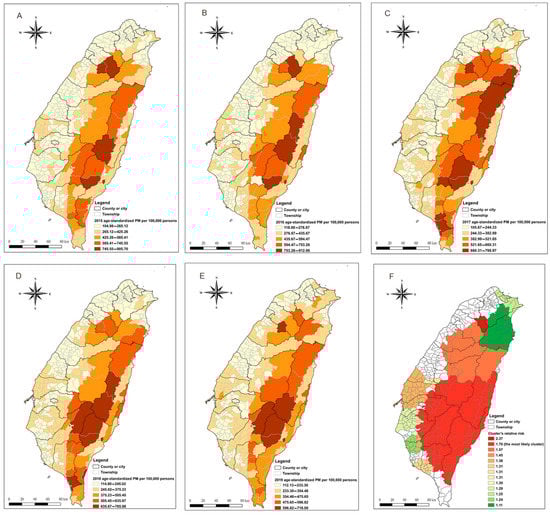 Geographical distribution and spatiotemporal clusters of age-standardized premature mortality. (A–E) Geographical distribution of age-standardized premature mortality in the township level of Taiwan from 2015 to 2019. (F) The significant spatiotemporal clusters of premature mortality from 2015 to 2019. The black line indicates a county or city boundary. The grey line indicates the boundary of a township/neighbourhood within a county or city.