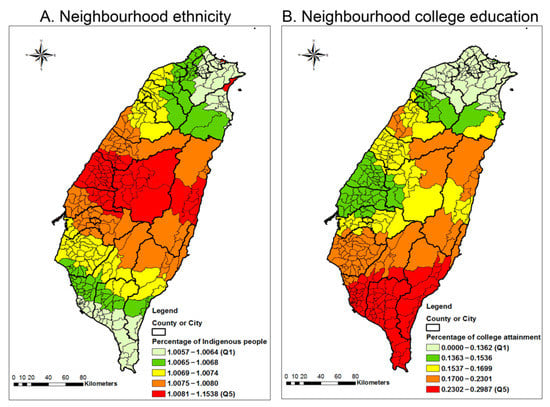 We selected three upstream social determinants of health inequalities: ethnicity, education, and income. The townships were considered as the neighbourhoods in this study. Ethnicity was measured using the annual percentages of indigenous people for each neighbourhood (i.e., township) from 2015 to 2019. This was calculated by dividing the number of indigenous residents in each neighbourhood by the neighbourhood-level population. The number of indigenous people in each neighbourhood from 2015 to 2019 was acquired from the Socio-Economic Geographic Information System (SEGIS) maintained by the Department of Statistics, Ministry of the Interior [].