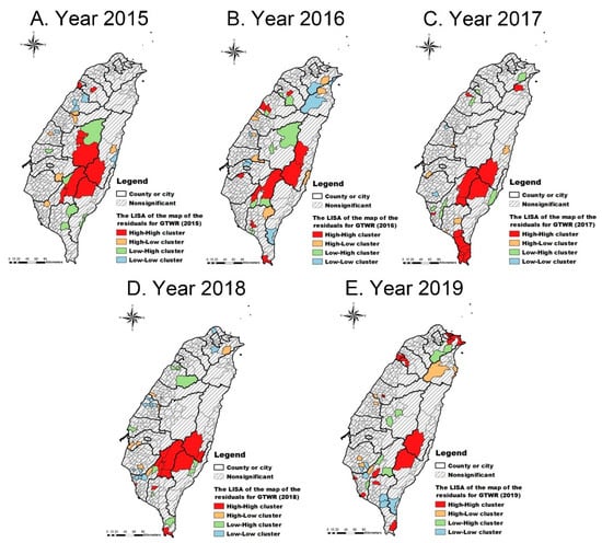 To explore the distribution of clusters for premature mortality after the adjustment for the spatial patterns in the SDOH we explored, a map of local Moran’s I of residuals for GTWR was conducted and is presented in Figure 3. In these maps (Figure 3A–E), after the adjustment for the neighbourhood SDOH, the hotspots for premature mortality decreased significantly, with only a handful of townships/neighbourhoods left, which were mainly rural and indigenous areas in the central-south region of Taiwan. This result indicated that some variations in those neighbourhoods could not be explained by the three neighbourhood SDOH—ethnicity, education, and income.
