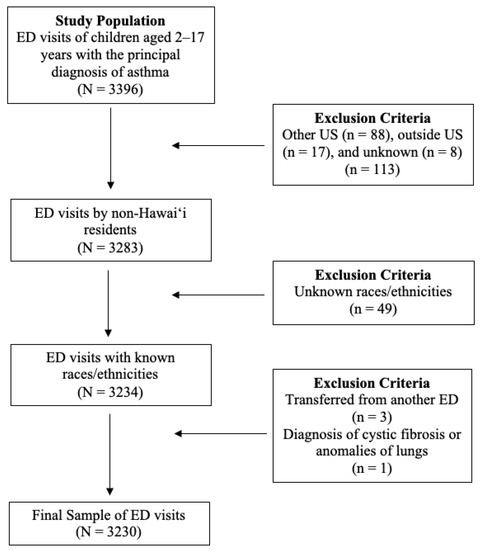 All ED visits of children who were between the ages of 2 to 17 years old with the principal diagnosis of asthma were considered. As this study specifically focused on the racial or ethnic populations of Hawai‘i, non-Hawai‘i residents and records lacking race or ethnicity data were also excluded. Additionally, transfers from another ED facility and children with any listed ICD-9 or ICD-10 diagnosis codes for cystic fibrosis and anomalies of the lungs were excluded to meet AHRQ potentially preventable pediatric ED visits for asthma specifications [8,9]. More detail about specific ICD-9/ICD-10 diagnosis codes for cystic fibrosis and anomalies of the respiratory system are provided by AHRQ [8,9]. A total of 3230 ED visits were considered (see Figure 1).