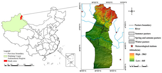 Grassland is the primary ecosystem type in this region, covering almost 80% of the whole area. Herders graze on the grasslands at different altitudes in different seasons. According to the time that the herdsmen utilize the grassland, the grasslands are divided into different seasons (summer pasture, spring and autumn pasture, and winter pasture). Summer pastures are mostly high-quality pastures and are mainly distributed in the Altai Mountains above 1200 m. Grazing starts in early June and ends in early September for about 90 days. Winter pastures are distributed below 500 m, and most of them are inferior pastures, which are mainly composed of temperate deserts. The grazing period starts in early December and ends in late March of the following year for about 120 days.