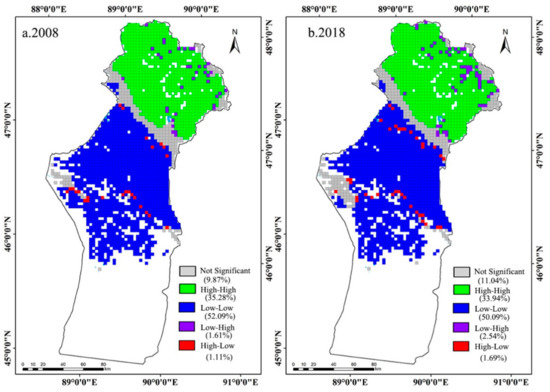 In order to better characterize the spatial differentiation characteristics of ecological environmental quality, a 3 km × 3 km grid was used to resample the spatial images of the MODEI in the study area in 2008 and 2018, and 2248 grids were obtained, respectively, which were used to further describe the spatial agglomeration characteristics of regional ecological quality. Figure 3 shows Moran scatter plots of the MODEI in Fuyun County in 2008 and 2018. The points in the four quadrants of the scatter plot, respectively, represent four different types of spatial connections formed between a certain area and the surrounding area. The grids were mainly distributed in the first quadrant and the third quadrant, indicating that the distribution of the MODEI had an obvious spatial positive correlation, showing a clear trend of high–high (HH) and low–low (LL) aggregation, and the clustering effect of grids and adjacent grids was significant. The degree of auto-correlation in 2018 was relatively weak compared with that in 2008, implying that HH aggregation or LL aggregation in the MODEI was slightly weakened in 2018, while the random distribution trend was slightly enhanced.