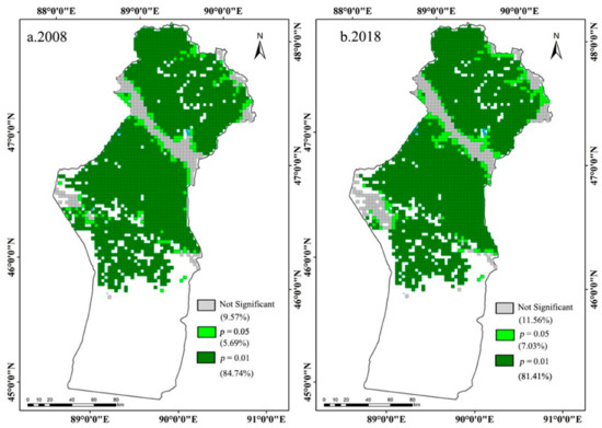 The spatial distribution features of the MODEI were visualized by the LISA clustering map and the LISA significance level map (Figure 4 and Figure 5). As shown in Figure 4, the HH area was mainly distributed in summer pastures, while the LL area was located primarily in spring and autumn pastures and winter pastures. The LH region was scattered in the HH region of the summer pastures. The HL region was mainly distributed along the Irtysh River and the Ulungur River. Compared with 2008, the LH area and HL area expanded in 2018. A percentage of 84.74 and 81.41 of the region reached the significance level of 0.01 in 2008 and 2018, respectively. The region of the significance level of 0.05 was mainly distributed at the edge of the 0.01 significance area and the edge of the two rivers (Figure 5).