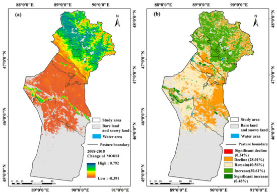 Changes in MODEI from 2008–2018 in Fuyun County. (a) 2008; (b) 2018.