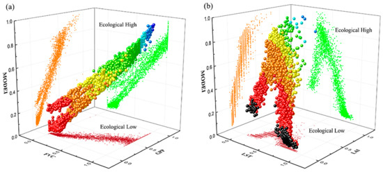 In addition, a total of 4496 points were collected in 2008 and 2018. The relationship between the MODEI and the four indicators with the largest contribution rate (FVC, GPP, LST and LAI) was analyzed, and the MODEI samples were projected into the three-dimensional space (Figure 8). In Figure 8a, the top of the scatter plot represents the area with better ecological quality, which has higher FVC and higher GPP. Conversely, the bottom of the scatter plot represents the area with poor ecological quality, which has lower FVC and lower GPP. Multiple linear regression models also showed that both FVC and GPP had a positive contribution to ecological quality. The top of the scatter plot represents an excellent ecological environment with higher LAI and lower LST (Figure 8b), indicating that LST and WET had opposite effects on ecological quality, which was consistent with the results of principal component analysis and regression models.