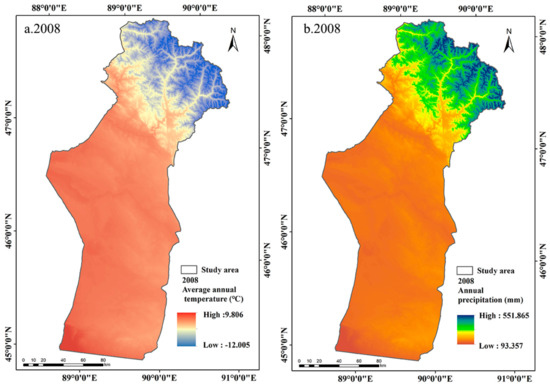 The above MODIS data products have undergone radiometric calibration and atmospheric correction, and the data products were acquired from July to September in 2008 and 2018. This period is the vegetation growing season, and it is easy to distinguish between vegetation areas and bare snow areas. In this paper, MODIS Reprojection Tool software was used for data mosaic and projection conversion of each indicator raster datapoint. The unified resolution was 500 m × 500 m, and the projection was GCS_WGS_1984. In the process of data screening, the data with less cloud cover and of high quality were selected to calculate the average value of the five indicators from July to September. Water area, bare land, and snow area cannot participate in ecological evaluation effectively because some indicators have no value, so the water area, bare land, and snow area were excluded by mask. The meteorological data used in this study were obtained from the China Meteorological Science Data Sharing Service Network (http://data.cma.cn/ (accessed on 5 March 2021)), and the temperature and precipitation data from 54 national meteorological stations in Xinjiang Uygur Autonomous Region were collected. The statistical data were obtained from the Statistical Yearbook of Fuyun County.