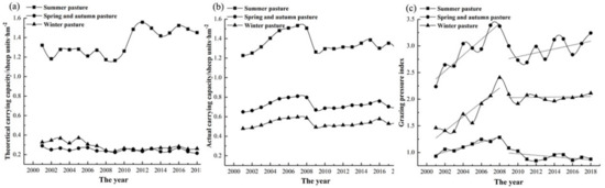 Changes in theoretical carrying capacity (a), actual carrying capacity (b), and grazing pressure index (c) in Fuyun County from 2001 to 2018.