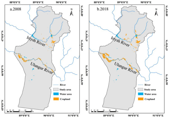 In addition, the MODEI improved significantly in the areas that were also distributed on both sides of the Irtysh and Ulungur rivers, which was possibly caused by the settlement project of herdsmen. The families of herdsmen who moved to the newly settled village were given an average of 3.3 hectares of farmland to plant artificial grassland [38]; as a result, the area of artificial grassland has significantly increased. In addition to artificial grassland, the area of cropland also increased. The cropland area in Fuyun County was 378.39 km2 and 474.38 km2 in 2008 and 2018, respectively, with an increase of 25.37% (Figure 13). Therefore, due to the planting of artificial grassland and the increase in cropland, the MODEI of some areas on both sides of the river improved.